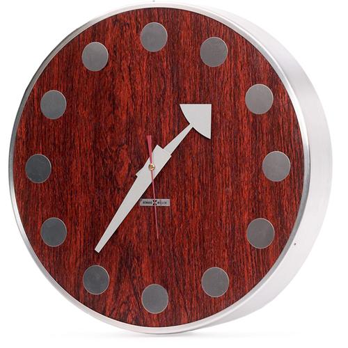 George Nelson Associates Meridian clock, by Howard Miller, designed by Arthur Umanoff, rosewood face with aluminum hour markers and hands in an aluminum case, metal tag on front and paper label on back, original finish, battery operated, 12.75"dia., very