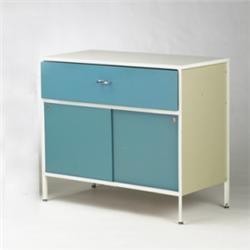 George Nelson & Associates Steelframe cabinet, model #4032B Herman Miller USA, 1955 lacquered wood, laminate, lacquered and chrome steel 32.25"w x 18.5"d x 29.5"h Single drawer and two sliding doors in Electric Blue. Signed with factory label.