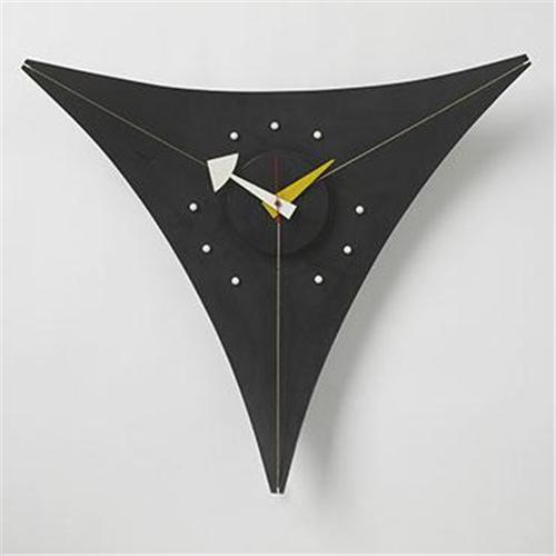 George Nelson & Associates<BR>Triangle wall clock, model 2225A<BR>Howard Miller<BR>USA, 1955<BR>masonite, lacquered wood, steel wire<BR>20.5 w x 18 d x 3.5 h inches<BR>Signed with decal manufacturer's label to reverse: [Howard Miller Clock Company Zeeland Michigan] with impressed model number: [2225].<BR><BR>Condition of the item is not included in this description. Condition reports are available from Wright upon request. Wright strongly recommends that you review a condition report for each item on which you plan to bid.
