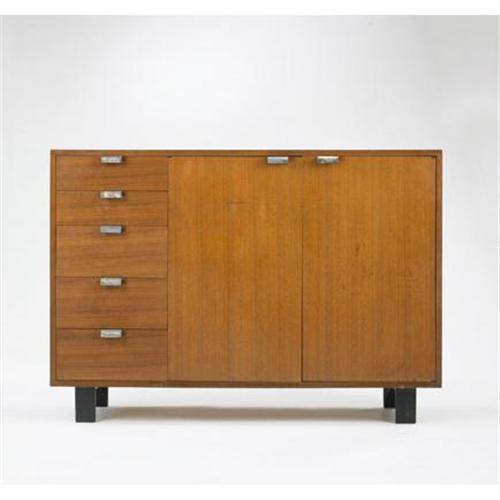 56 w x 20 d x 39.5 h inches<BR><BR>Condition: Heavier wear throughout walnut surfaces consistent with age and moderate use, in the form of scattered abrasions, dents and gouges. Largest gouge, located to front of middle door, measuring approximately 4 inches in length. Scattered abrasions and loss to ebonized wood feet, concentrated to the edges. Moderate oxidation to aluminum pulls. Cabinet is structurally sound. Surfaces could benefit from professional restoration.