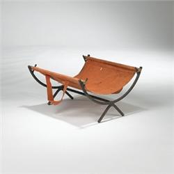 George Nelson & Associates log rack with canvas carrier Howard Miller USA, 1951 enameled iron, canvas, birch 21"w x 21.5"d x 12"h Nelson designed a entire range of fireplace tools and accesories for Howard Miller in 1951.