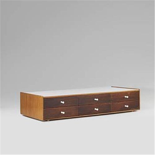 George Nelson & Associates miniature chest, model #5215 Herman Miller USA, c. 1955 teak, rosewood, laminate, enameled steel 30.25 w x 13.75 d x 6.25 h inches