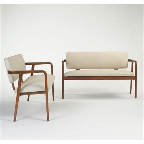 51.5 w x 25 d x 30.75 h inches<BR><BR>Condition: Wood surfaces appear to have been refinished with variations in color. Upholstery has been professionally replaced. Old dents and abrasions to each concentrated to armrests and edges from use. Overall fine vintage condition.