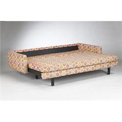 George Nelson & Associates sleeper sofa Herman Miller USA, c. 1965 steel frame with wool upholstery over foam 81"w x 36"d x 28"h The seat of this sofa pulls out from the backrest allowing a queen size sleeping surface. The sofa is upholstered in original Alexander Girard 'Hexagons' fabric. Foil label.