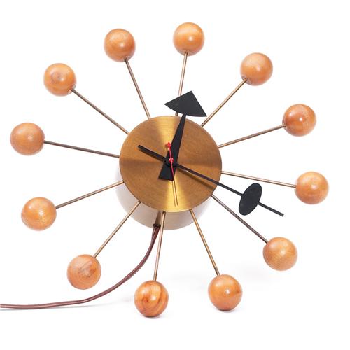 George Nelson Ball clock, by Howard Miller, brass center surrounded by brass rods with natural birch wood balls, original finish, Howard Miller label, 13"dia., second hand intact, cord replaced, very good condition