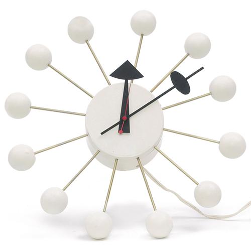 George Nelson Ball clock, by Howard Miller, white painted wood center surrounded by brass rods with white painted wood balls, cleaned original finish, howard Miller label,13in.dia., second hand intact, some wear,very good condition