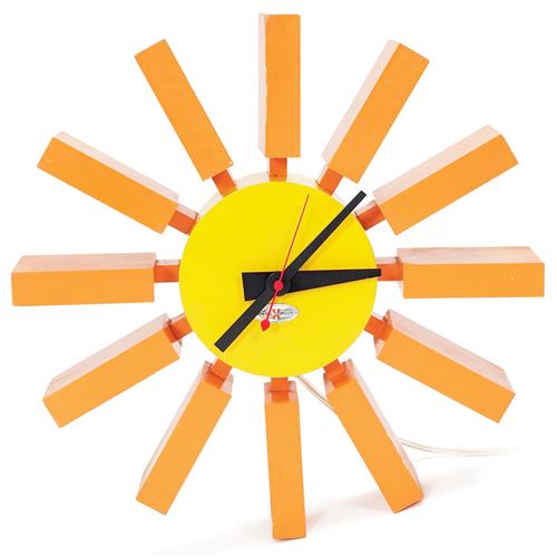 George Nelson Block clock, by Howard Miller, model no. 2285, orange blocks around a yellow enameled metal center, includes original red second hand, marked with Howard Miller decal to front and back and impressed marks, original finish, 11.25in.dia., exce