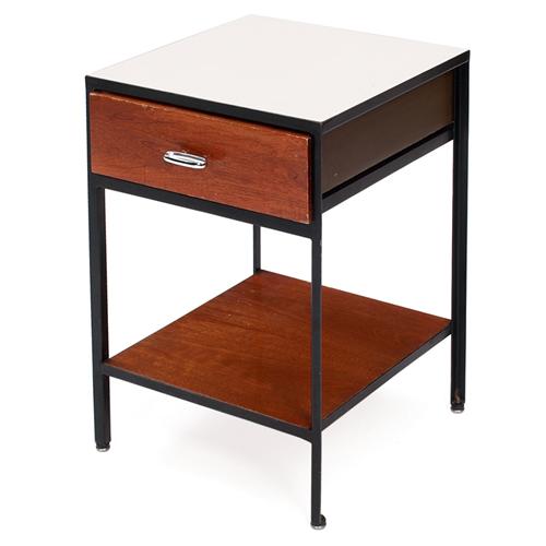 George Nelson Steelframe end table/nightstand, by Herman Miller, black enameled steel frame with walnut drawer front and lower shelf under a white laminate top, original drawer pull, marked with round metal tag, original finish, 16.75"w x 18.5"d x 24.5"h,