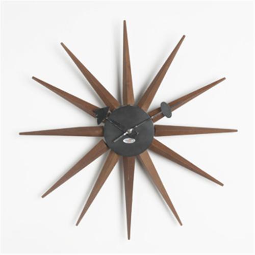 George Nelson and Associates Spike wall clock, model #2202 Howard Miller USA, 1953 walnut, enameled metal 18.75"dia Signed with decal label.