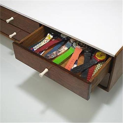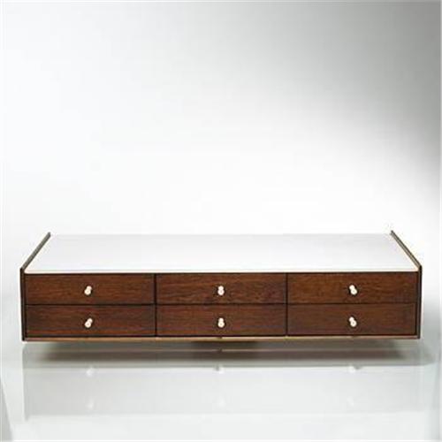 Teak, rosewood, laminate, enameled aluminum 30.25"w x 13.5"d x 6"h Disc label to interior of middle drawer.