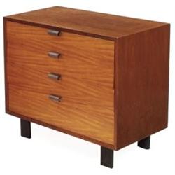 George Nelson cabinet, by Herman Miller, walnut case with primavera front, four drawers with original pulls, 34”w x 18.5”d x 30”h, original finish, signed, very good condition