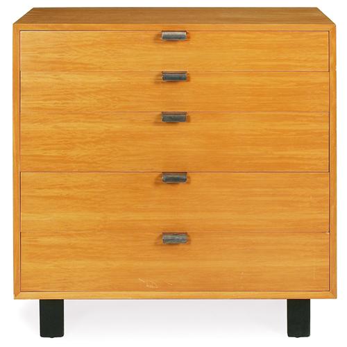 George Nelson cabinet, by Herman Miller, birch, five drawers with original curved metal pulls over ebonized wood legs, marked with foil label and stenciled 4620in., top refinished,40in.w x 18.5in.d x 40in.h,very good condition