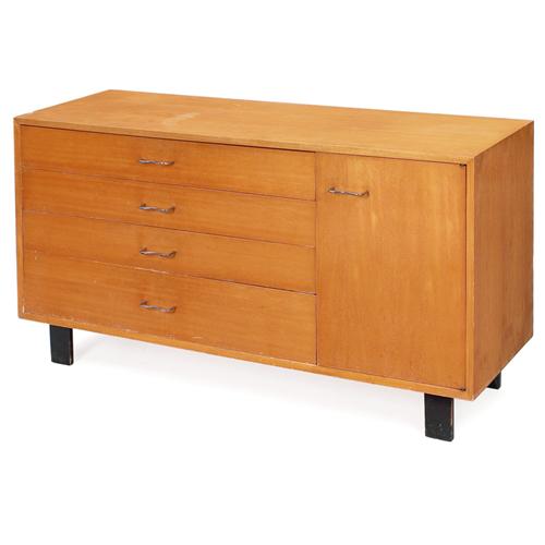George Nelson cabinet, by Herman Miller, birch, four drawers and one door with original M-shaped pulls, interior contains two adjustable shelves, dividers in two drawers, original finish, signed with foil label, 56.25in.w x 18.5in.d x 30in.h,very good ori