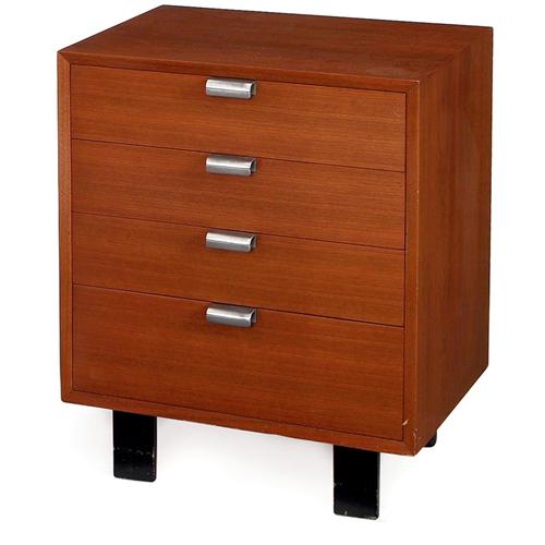 George Nelson cabinet, by Herman Miller, walnut, four drawers with original curved pulls over ebonized wood legs, marked with foil label,24in.w x 18.5in.d x 29.5in.h, very good original condition