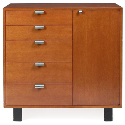 George Nelson cabinet, by Herman Miller,walnut, five drawers and one door with original curved pulls over ebonized wood legs, two interior shelves, original finish,40in.w x 18in.d x 39.75in.h, excellent condition