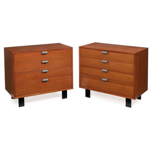 George Nelson cabinets, pair, by Herman Miller,walnut, each with four drawers with original curved pulls over ebonized wood legs, each marked with foil label, 34in.w x 18.5in.d x 29.5in.h,very good original condition