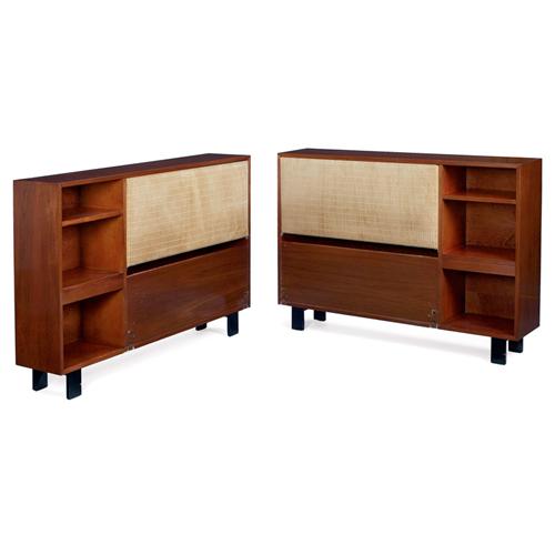 George Nelson king-size headboard, by Herman Miller,1950s, two walnut wood cases over ebonized wood legs with drop-down padded backrests which conceal storage space, built-in storage on each side with two shelves and one pull-out shelf, can be used as two