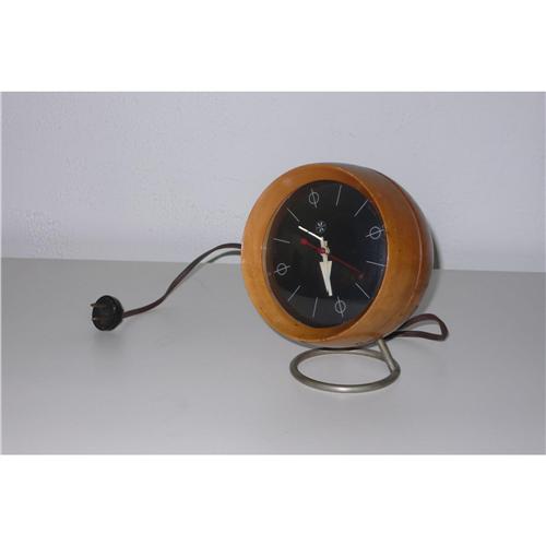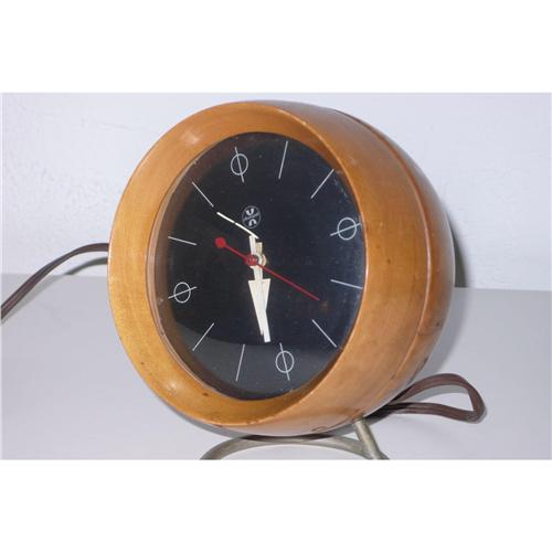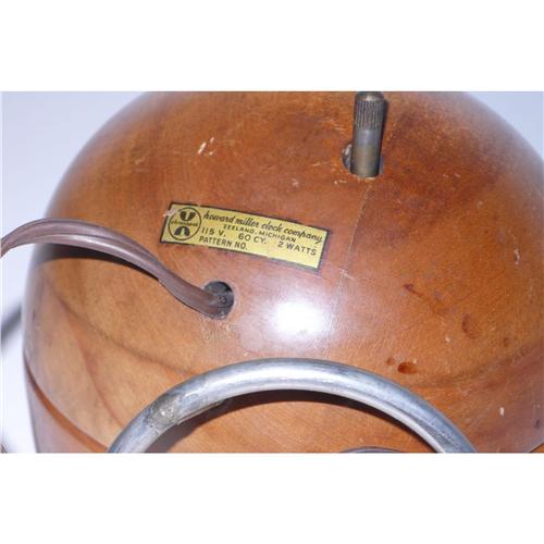 George Nelson mfg by Howard Miller wood table clock with original wire, original bakelite switcher, labeled on the bottom, 7h x 5dia x 5d inches in original condition