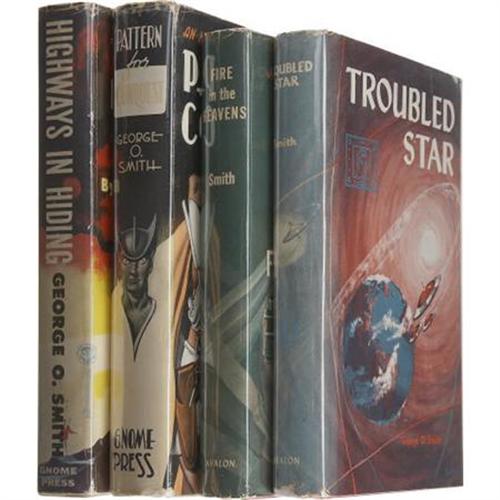 <B>George O. Smith: Four Books. </B></I> Includes the following:<BR><B><I>Pattern for Conquest.</B></I></B></I> (New York: Gnome Press, 1949), first edition signed, 252 pages, peach boards, 8vo, dust jacket. Condition (book/ dj): good/ very good.<BR><B><I>Fire in the Heavens.</B></I></B></I> (New York: Avalon Books, 1958), first edition, 224 pages, red boards, 8vo, dust jacket. Condition (book/ dj): very good/ good.<BR><B><I>Highways in Hiding.</B></I></B></I> (New York: Gnome Press, 1955), first edition, 223 pages, cream boards, 8vo, dust jacket. Condition (book/ dj): very good/ good.<BR><B><I>Troubled Star.</B></I></B></I> (New York: Avalon Books, 1957), first edition, 220 pages, red boards, 8vo, dust jacket. Condition (book/ dj): very good/ good.<BR><BR><BR><b>Shipping:</b> Books & Catalogs (<a target="_blank" href="http://www.heritageauctions.com/common/shipping.php">view shipping information</a>)