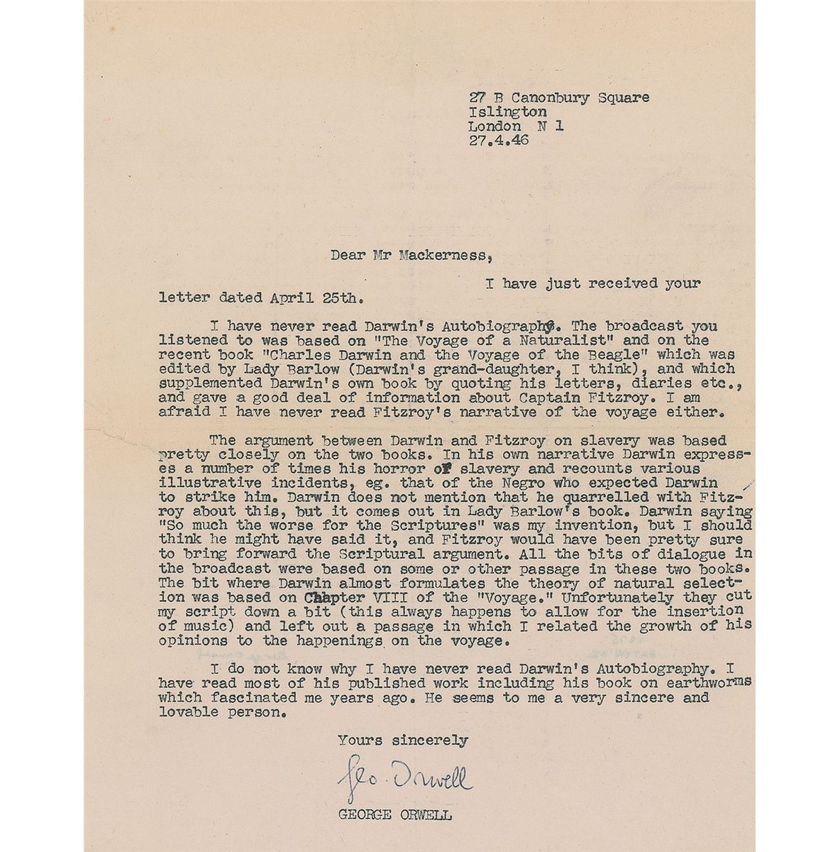TLS signed “Geo. Orwell,” one page, 8 x 10, April 27, 1946. Letter to Mr. Mackerness. In part: “I have never read Darwin's Autobiography. The broadcast you listened to was based on 'The Voyage of a Naturalist' and on the recent book 'Charles Darwin and the Voyage of the Beagle' which was edited by Lady Barlow (Darwin's grand-daughter, I think), and which supplemented Darwin's own book by quoting his letters, diaries etc., and gave a good deal of information about Captain Fitzroy. I am afraid I have never read Fitzroy's narrative of the voyage either.