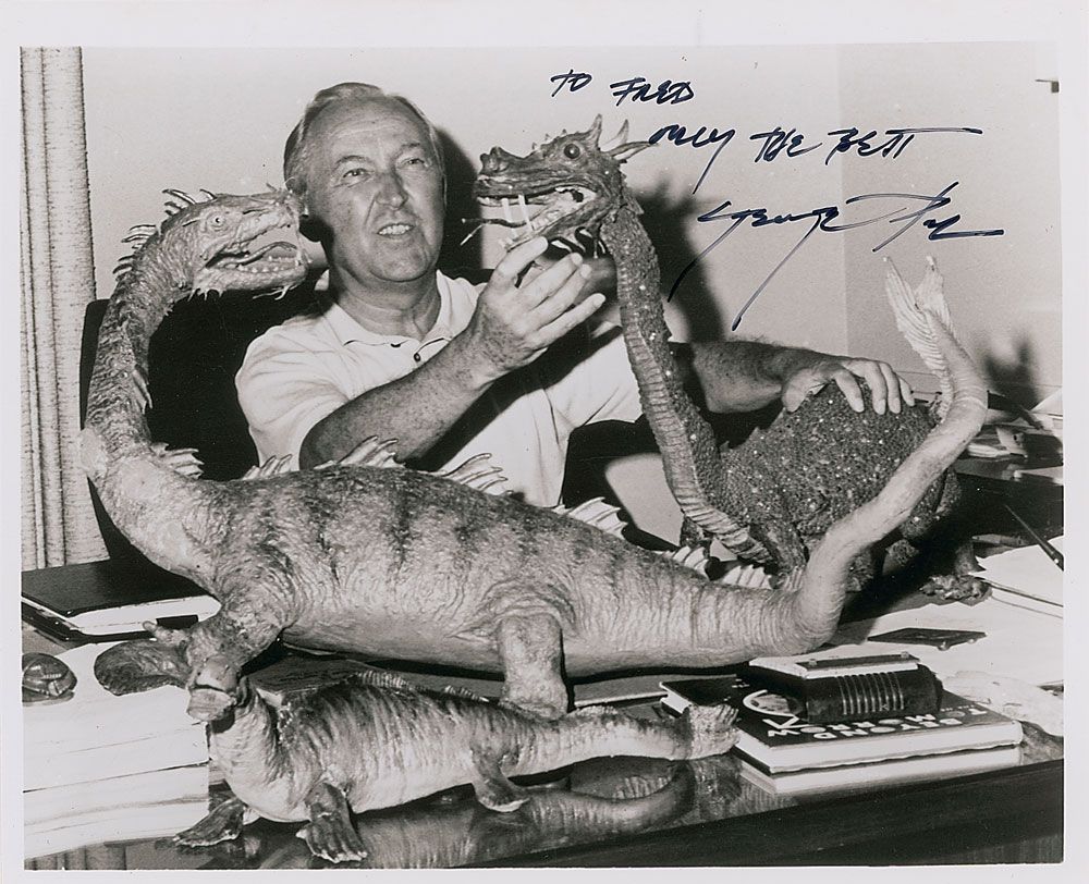 Science fiction film producer and animator (1908–1980). Glossy 10 x 8 photo of Pal working with two of his monster models, signed and inscribed in black felt tip “To Fred, only the best, George Pal.” In fine condition, with a few scattered light surface marks.