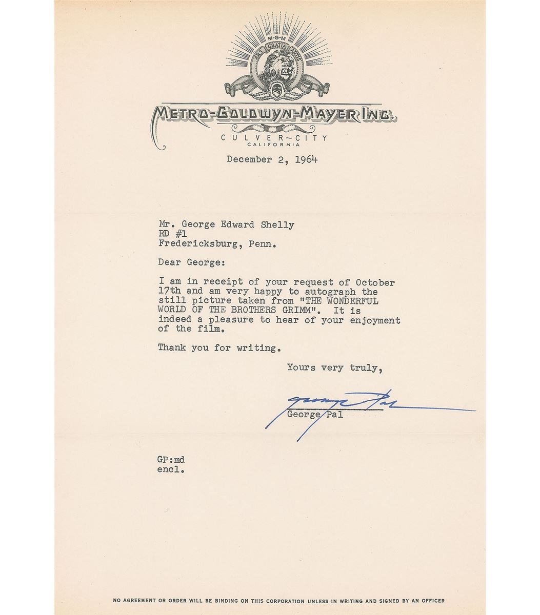 Science fiction film producer (1908–1980) whose work included War of the Worlds, The Time Machine, and The Wonderful World of the Brothers Grimm. TLS, one page, 7.5 x 11, Metro-Goldwyn-Mayer Inc. letterhead, December 2, 1964. Letter to a collector, in part: “I am…very happy to autograph the still picture taken from ‘The Wonderful World of the Brothers Grimm.’ It is indeed a pleasure to hear of your enjoyment of the film.” In fine condition, with a light crease to top edge.
