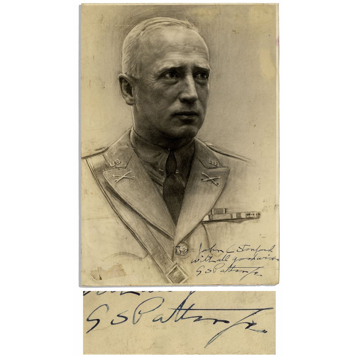 ''George Patton'' signed portrait. The WWII general inscribes the lower right corner, ''John C Stanford / with all good wishes / G S Patton Jr''. Stanford's US Army School Tank Corps certificate for Stanford accompanies the signed image. Bust portrait of Patton in uniform measures 6.75'' x 9.75''. Paper remnants to verso from mounting in an album, else near fine.