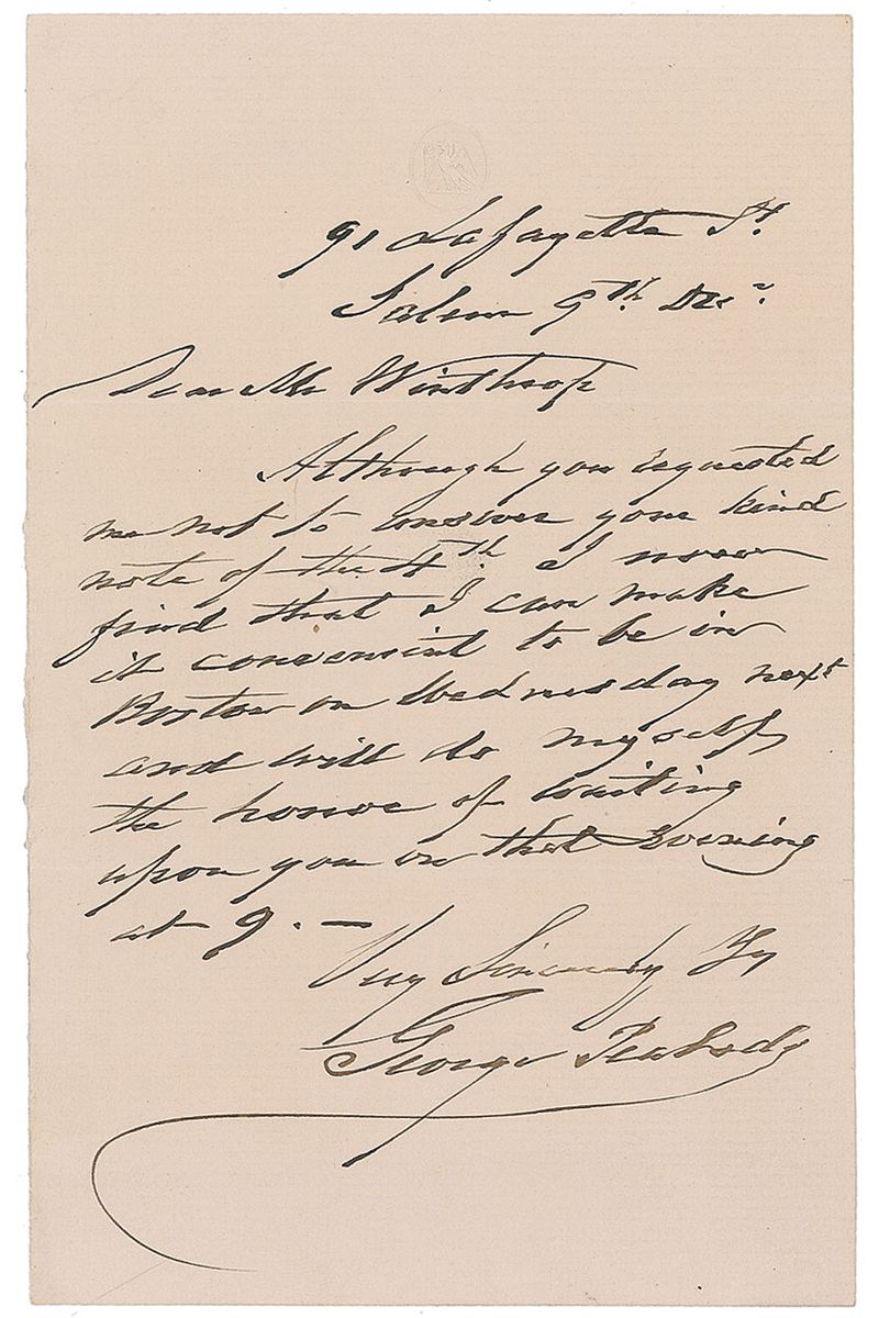 Pioneering American entrepreneur and philanthropist (1795–1869) who lent his support to such venerable institutions as the Peabody Institute in Baltimore and the Peabody Essex Museum in Salem, Massachusetts. Uncommon ALS, one page, 4.5 x 7, December 9. Letter to Mr. Winthrop. In full: “Although you requested me not to answer your kind note of the 4th I now find that I can make it convenient to be in Boston on Wednesday next and will do myself the honor of waiting upon you on that evening at 9.” In fine condition.
