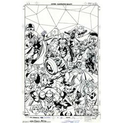 George Perez - Original Cover Art for Avengers Visionaries Trade Paperback (Marvel, 1999). This incredibly detailed cover was specially created for the trade paperback by Gentleman George Perez. The book reprints a classic Avengers storyline featuring the Squadron Sinister drawn by Perez. Even close-up it is hard to imagine how this work should ever have to be reduced because the detail is incredible. Any one part of this work could be a cover in itself! Some slight white-out and rework on Thor's hand and Cap's shield but otherwise pristine. Overall size is 11" x 17", image size is 10" x 15". Signed by the artist at the bottom of the page. Important notice: We expect to be auctioning lots at the rate of 200-250 per hour. Sometimes eBay Premier live bid software cannot keep up with that pace, so we strongly recommend that you place a realistic proxy bid now as insurance to avoid disappointment. Also please note that all Heritage/CAA lots purchased through eBay Premier carry a 20% Buyer's Premium. Please make sure you read the Terms and Conditions.