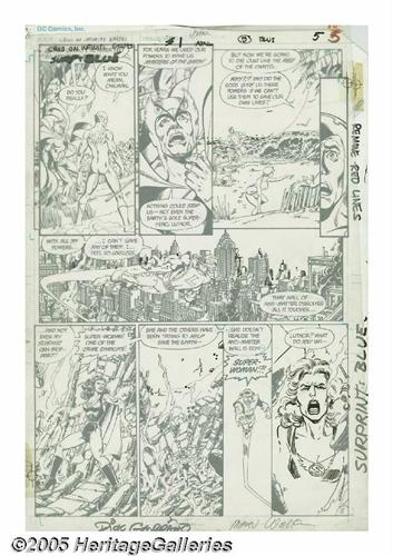 <B>George Perez and Dick Giordano - Crisis on Infinite Earths #1, page 5 Original Art (DC, 1985).</B></I> The alternative world hero, Lex Luthor Jr., flies low over the approaching wall of anti-matter as it dissolves everything it touches -- including Super-Woman, one of the Crime Syndicate! George Perez's detailed pencils are given the Dick Giordano touch with a crisp ink finish. The image area of the art is 10" x 15". The corners of the paper, and the top edge have been cut, and there are two aged crop marks -- all outside of the image area; otherwise the art is in Excellent condition. Some special effects, and the image of Super-Woman in the last panel are inked on a separate vellum overlay. Signed by Marv Wolfman and Dick Giordano.