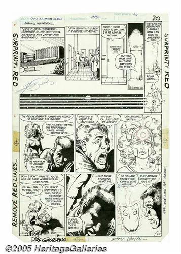 <B>George Perez and Dick Giordano - Crisis on Infinite Earths #1, page 20 Original Art (DC, 1985).</B></I> <B>Crisis on Infinite Earths</B></I> was a sweeping 12-issue series which included just about every hero and villain ever published by DC, saw trillions of lives snuffed out, and even dared to picture the deaths of two of DC's most beloved characters. The Monitor's beautiful assistant, Harbinger, makes a play to get the Psycho-Pirate back in action, in this page from the story, "The Summoning." Soon, Roger Hayden will don his enchanted Medusa mask, to release the emotion-warping powers of the Psycho-Pirate! The image area of the page measures 10" x 15". There is some tape staining on three edges, and the top edge and three corners have been trimmed; otherwise the art is in Excellent condition. The page was signed by George Perez, Dick Giordano, and Marv Wolfman.