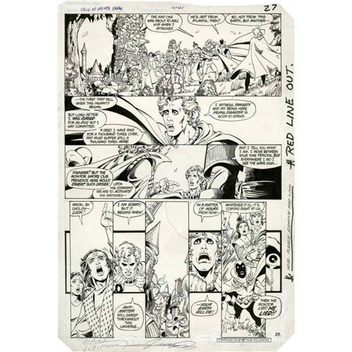 <B>George Perez and Dick Giordano - Crisis on Infinite Earths #2, page 23 Original Art (DC, 1985).</B></I> Pariah is cursed to forever appear where tragedy will occur, and that means disaster is about to strike! Anti-matter will soon sweep through the universe, and in a matter of hours Earth will die! Here is page 23 from the story, "Time and Time Again!," written by Marv Wolfman, from the second issue of one of the most heralded series of all time -- <B>Crisis on Infinite Earths</B></I>. The image area measures 10" x 15", and, aside from some overall aging, and trimmed edges, the art is in Very Good condition. Signed by George Perez and Marv Wolfman along the bottom edge.