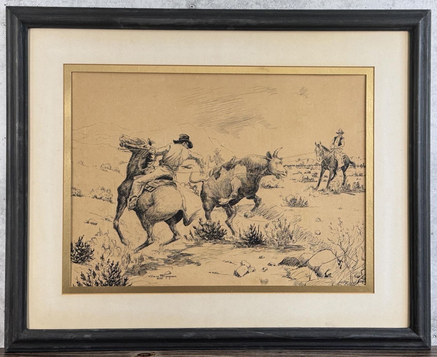 Title is Roping a Wild Steer. 16" by 22" unframed, 24 3/4" by 30 1/2" framed. Pen and Ink on Board. George Phippen (1915 - 1966) was active/lived in Arizona, Iowa. George Phippen is known for Cowboy genre, wildlife, sculptor. George Phippen was born July 11, 1915 in Iowa. His family moved from Iowa to Emmett (near St. Mary's, Kansas) in 1919. In 1933, at the age of 18, Phippen joined the Civilian Conservation Corps working first in Minnesota and then in Washington. Left the Corps in 1939 to return to Kansas for a year and then went back to Washington and California before settling in Tucson, AZ in 1940. During World War II, he wanted to be a combat artists for the Army, but was stationed at Fort Warden in Washington where he worked in photography and drafting. After the war, Phippen and his family moved to the Southwest, where he received informal tutoring in oil painting from Henry Balink of Santa Fe, NM and Hurlstone Fairchild of Tucson, AZ. Successful as a commercial artist and illustrator, he illustrated many books and magazines such as True West, Frontier Times, Quarter Horse Journal, Appaloosa News, and Western Horseman. Phippen began oil painting in 1948 while selling works for Christmas cards and calendars. He was co-founder and first president of the Cowboy Artists of America and he established a ranch, studio, and foundry in Skull Valley, AZ. The Phippen Museum in Prescott, AZ opened in 1984. He died in Skull Valley, Arizona on April 13, 1966.