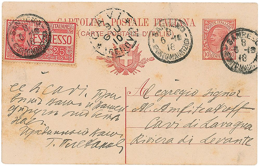 Russian revolutionary and one of the first Russians to self-identify as ‘Marxist’ (1856–1918), he lived in exile for many years under fear of political persecution. ALS in Russian on both sides of a 5.5 x 3.5 postcard, June 8, 1910. Untranslated letter to Alexander Amfiteatrov. In very good condition, with scattered creases and soiling, and a stamp to the front affecting a few words of the text.