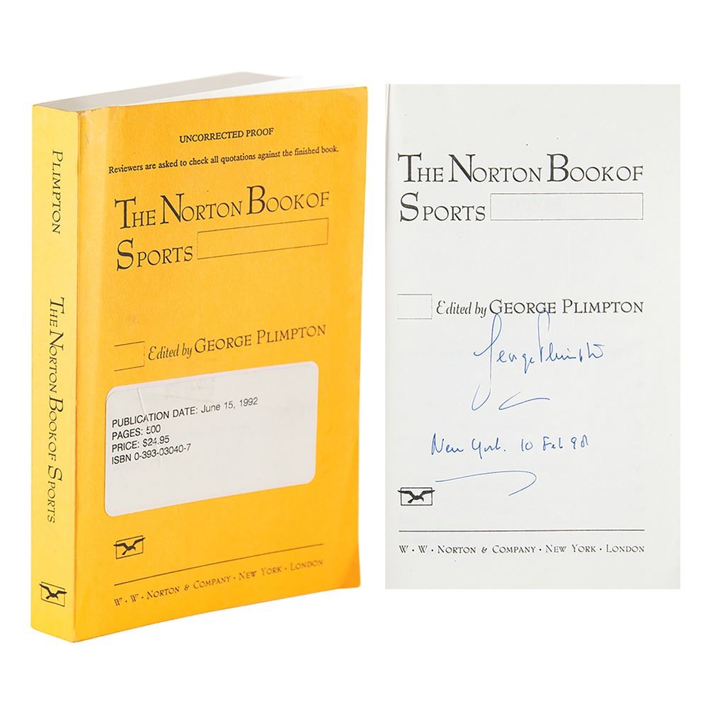 Signed book: An uncorrected proof of The Norton Book of Sports, Edited by George Plimpton, with a publisher's label to front cover noting a publication date of June 15, 1992. NY: W. W. Norton & Company. Softcover with plain yellow wrappers, 5.25 x 8.25, 485 pages. Signed on the title page in blue ink, "George Plimpton, New York 10 Feb. 95." The half-title page is also signed by some of the book's contributors: Donald Hall, Thomas McGuane, W. P. Kinsella, Diane Ackerman, Paul West, and T. Coraghessan Boyle. In fine condition, with light sunning to the spine.