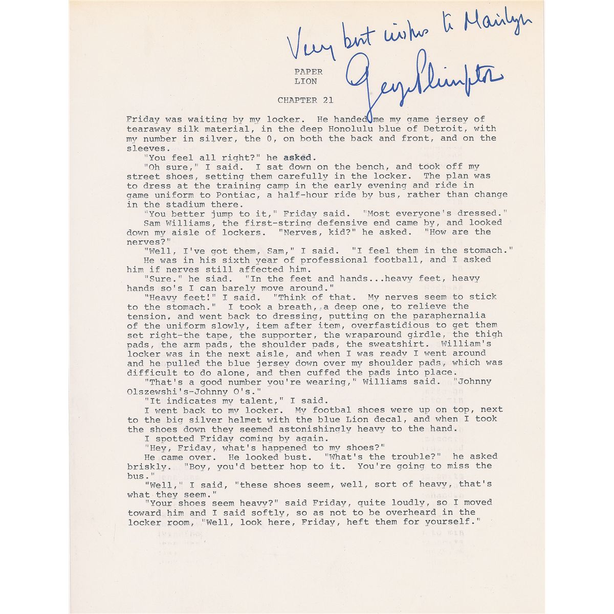 Souvenir typescript, one page, 8.5 x 11, an excerpt from chapter 21 of Paper Lion, signed and inscribed at the top in blue felt tip, “Very best wishes to Marilyn, George Plimpton.” In fine condition, with mild toning to the top and a slight crease to the lower left.