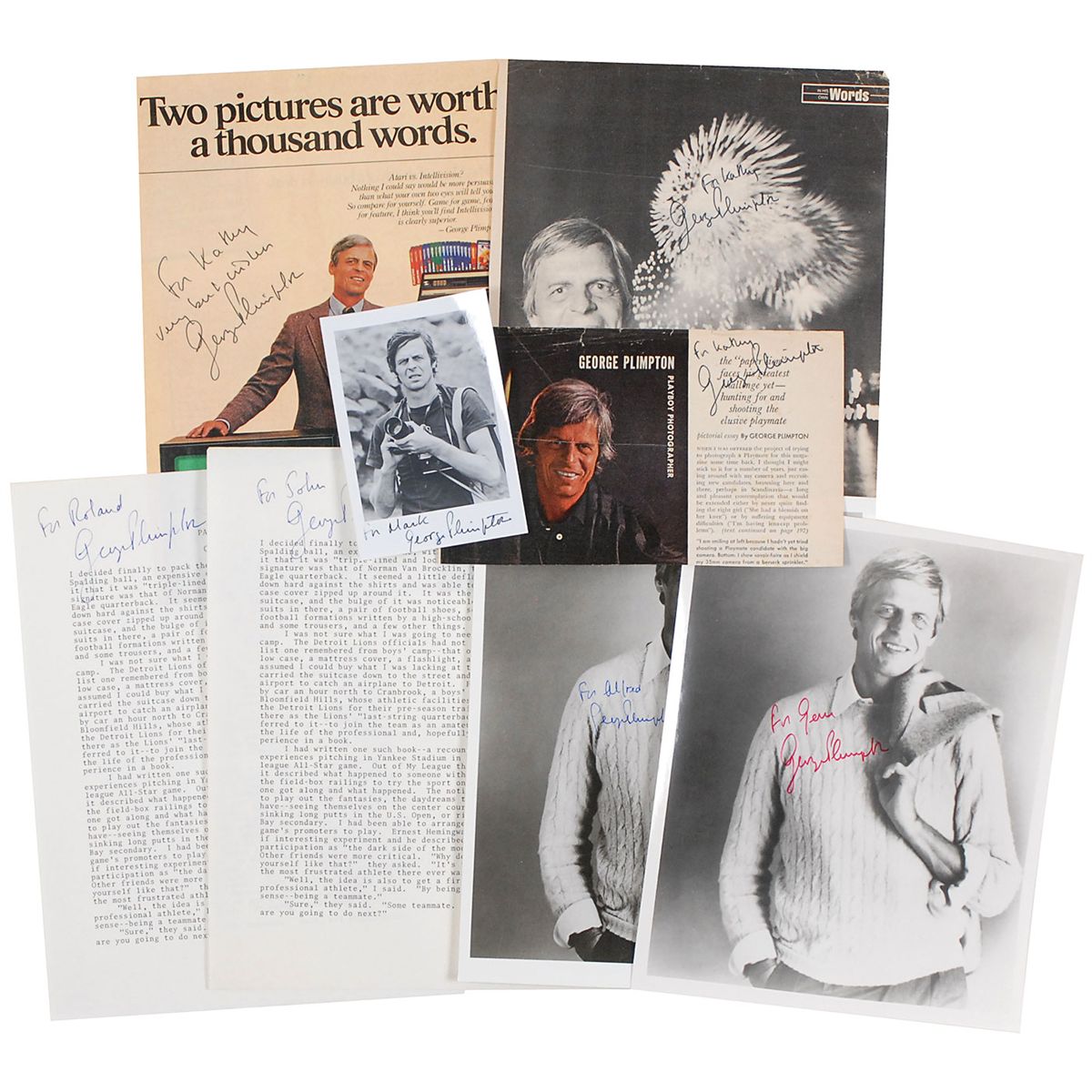 Eight items, including two souvenir typescripts, two glossy 8 x 10 photos, three different magazine photos, and a glossy 3.5 x 5 photo, each signed and inscribed in felt tip by Plimpton. In overall fine condition.