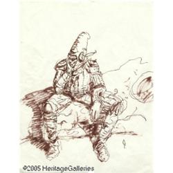 <B>George Pratt - Arzach Drawing Original Art (undated).</B></I> George Pratt has created a melancholy ink portrait of Moebius' enigmatic SF icon, Arzach, deep in thought. The image area of this ink on paper drawing measures approximately 8.5" x 9", and the art is in Excellent condition. The drawing was signed with the "P" monograph. This drawing is a delight for any fan of George Pratt and Moebius' Arzach; get your bid in today!