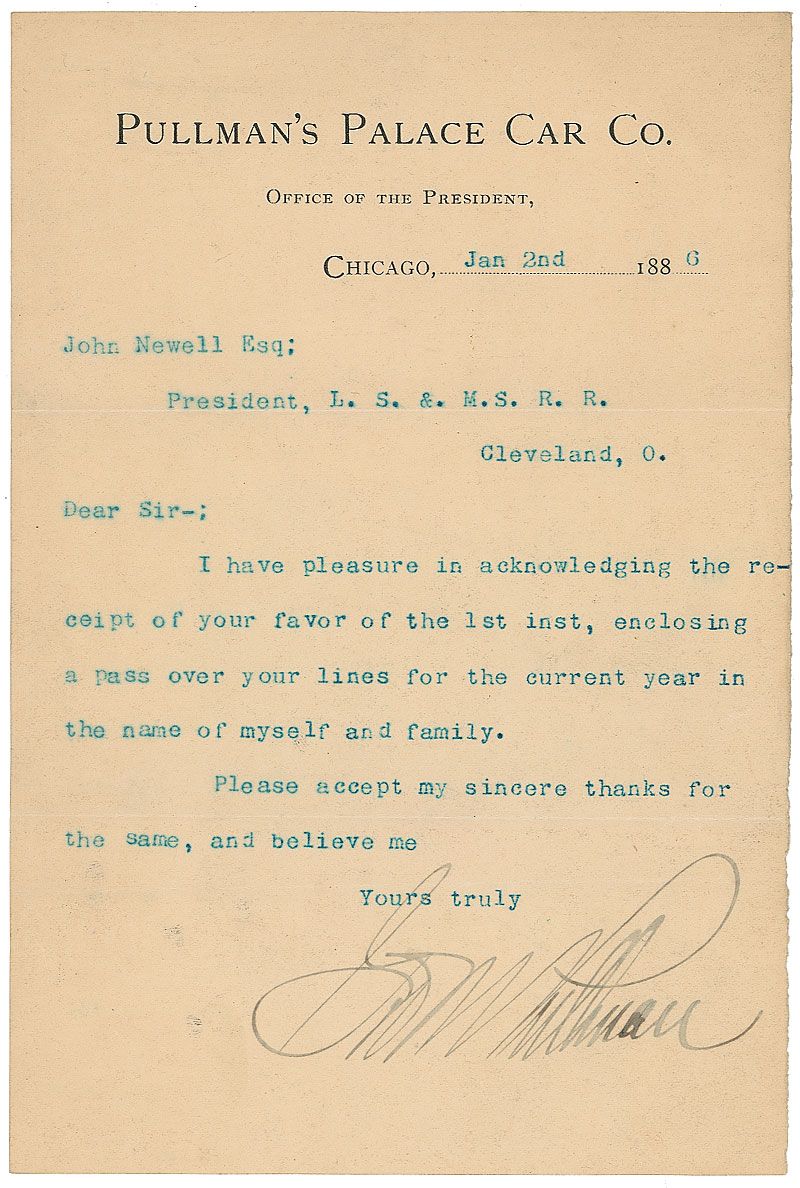 American inventor and industrialist (1831–1897) best known for developing the first successful railroad sleeping car. TLS signed “Geo M. Pullman,” one page, 5 x 7.75, Pullman’s Palace Car Co. letterhead, January 2, 1886. Letter to a railroad president. In part: “I have the pleasure in acknowledging the receipt of your favor of the 1st inst, enclosing a pass over your lines for the current year in the name of myself and family.” In fine condition, with a bit of mild wrinkling and a mild shade of overall toning.