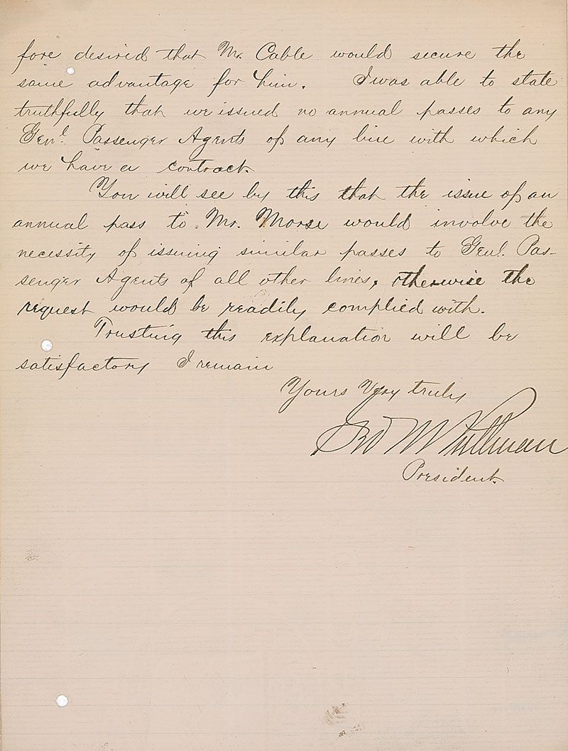 LS signed “Geo. W. Pullman,” two pages, 7.75 x 10.25, Pullman’s Palace Car Company letterhead, January 18, 1881. Letter to a general manager at Union Pacific Railroad. In part: “If the question was simply the issue of a pass to your General Passenger Agent, the request would be granted at once…unfortunately there is a precedent involved that would prove quite serious to this Company. I can explain by stating to you what occurred to me only last week. Cable of the Rock Island said that his Genl. Passenger Agent claimed that we issued Annual Passes…I was able to state truthfully that we issued no annual passes to any Genl. Passenger Agents.” Light toning and filing holes to left side, and office stamps and notations to the top, otherwise fine condition. An interesting letter discussing his successful business.