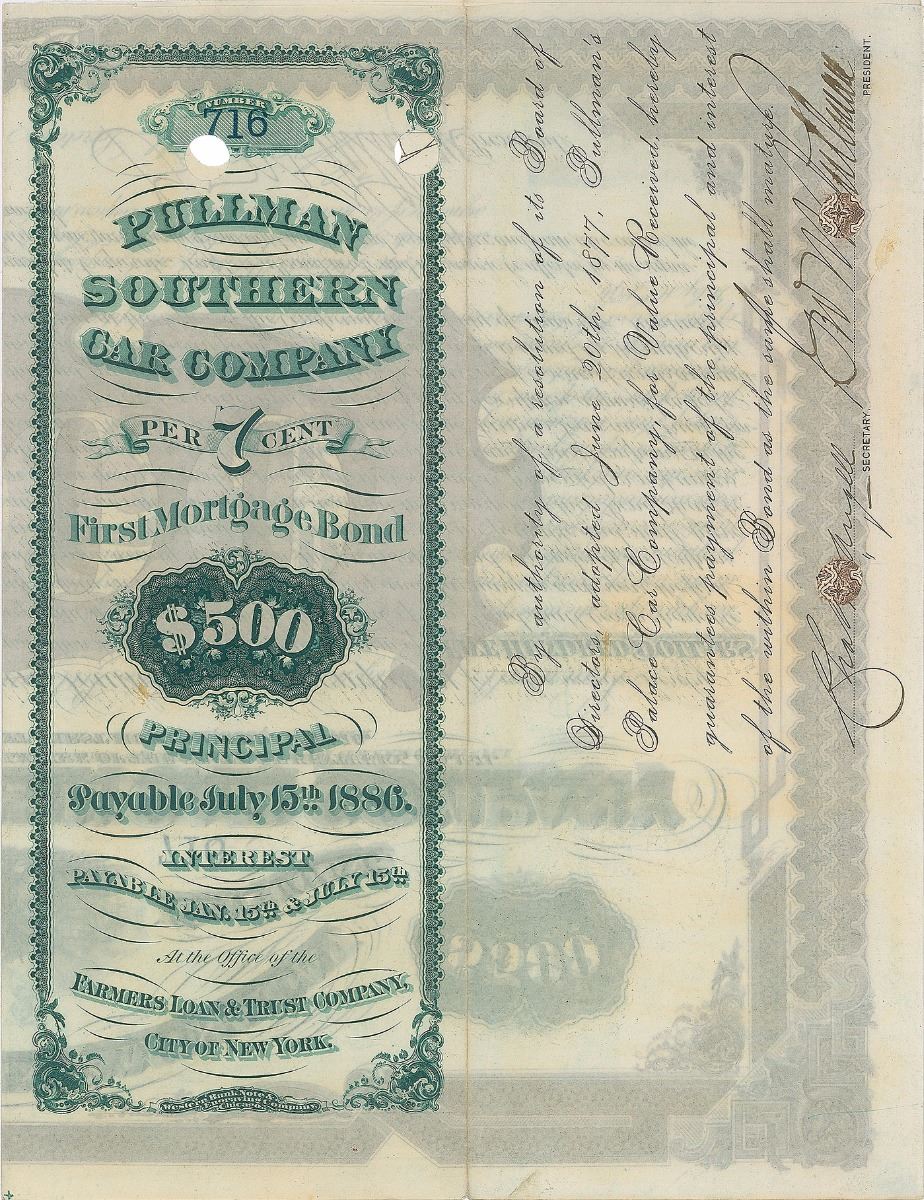 American inventor and industrialist (1831–1897) best known for developing the first successful railroad sleeping car. Partly-printed DS, signed twice, “Geo. M. Pullman,” one page, 16 x 10.5, July 10, 1876. Mortgage bond certificate for the Pullman Southern Car Company in the amount of $500. Signed at the conclusion by Pullman as the company’s president and countersigned by a secretary, and signed again by both on the reverse. In fine condition, with expected cancellation holes affecting a few letters in the signatures.
