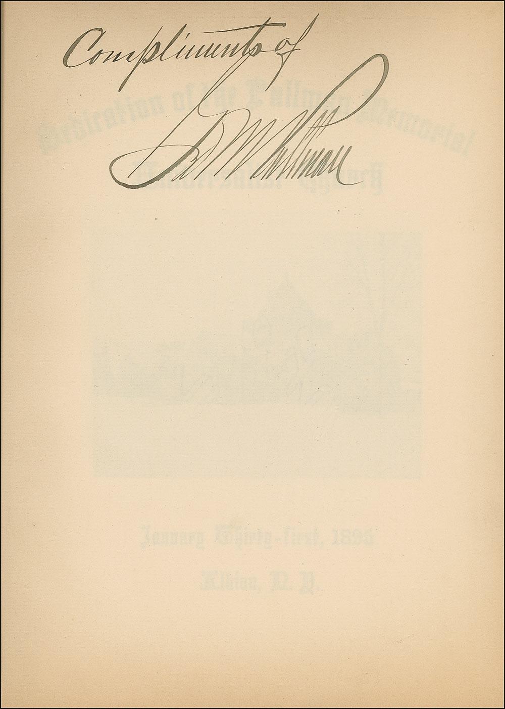 American inventor and industrialist (1831–1897) best known for developing the first successful railroad sleeping car. Hardcover booklet, titled Pullman Memorial Universalist Church Dedication Services, held on January 31, 1895, 7.5 x 10.25, 30 pages. Signed on the front blank page, “Compliments of G. W. Pullman.” In fine condition, with light overall toning to inside pages, and fragile hinges beginning to separate at top and bottom. Pullman is quite scarce in anything other than stock certificates. Pre-certified PSA/DNA and RRAuction COA.