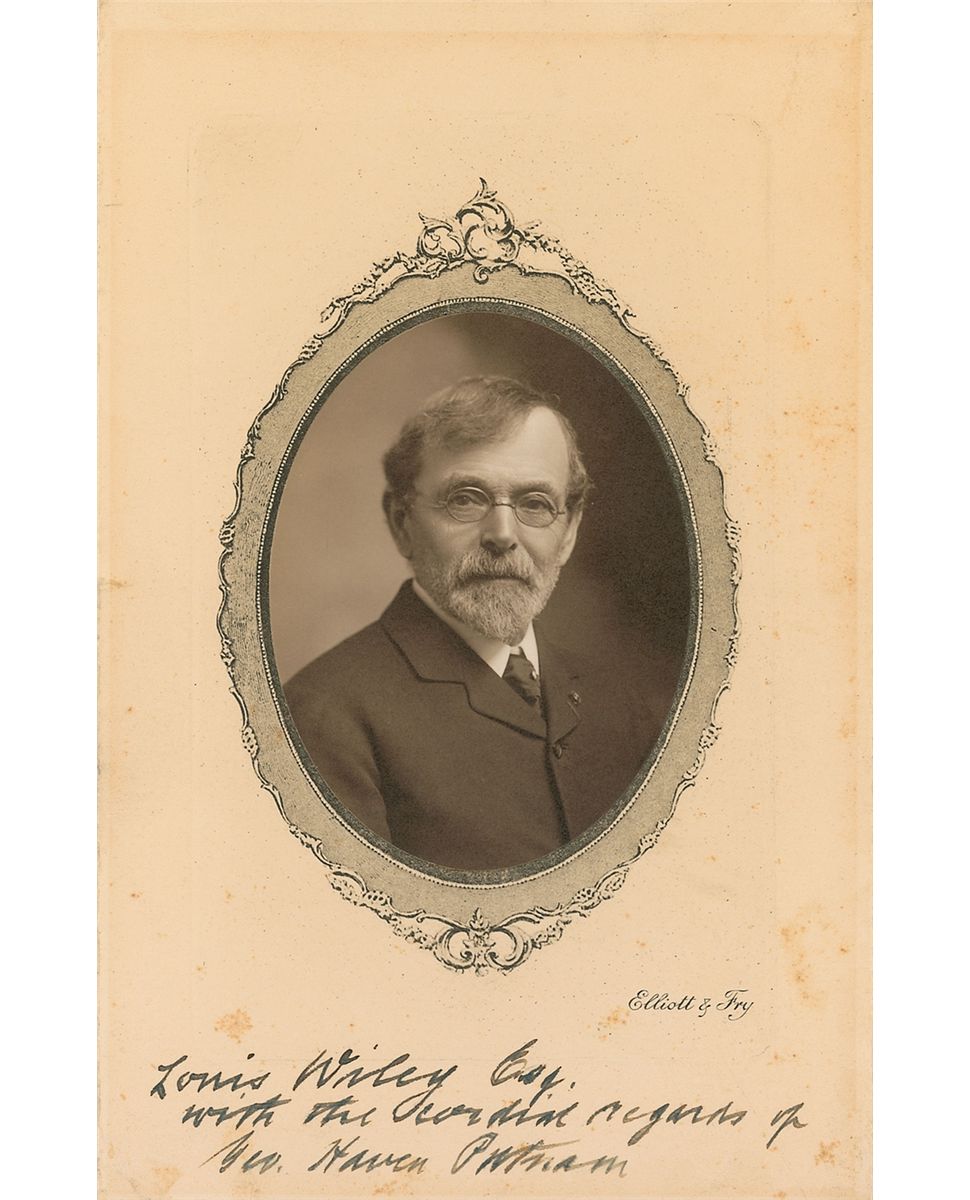 Soldier, publisher, and author (1844–1930) and eldest son of publisher George Palmer Putnam. Vintage matte-finish 2.25 x 3 oval photo by Elliott and Fry, and affixed to its original 4 x 6.25 mount, signed and inscribed in black ink “Louis Wiley Esq., with the cordial regards of Geo. Haven Putnam.” Scattered toning and foxing to mount, otherwise fine condition.