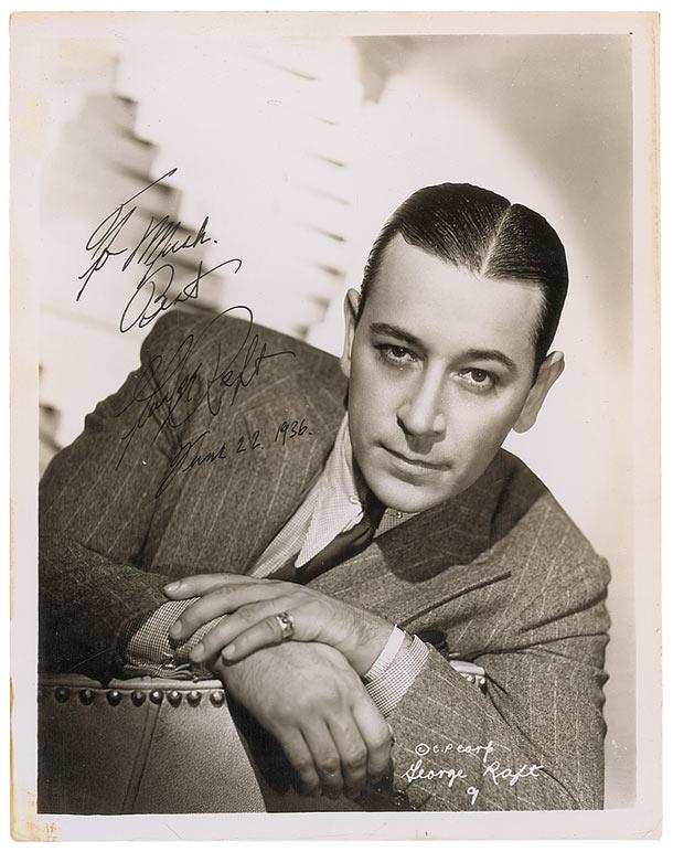 Striking vintage glossy 8 x 10 photo of Raft in a suit and tie, signed and inscribed in fountain pen, “To Mush, Best, George Raft, June 22, 1936.” In very good condition, with scattered surface marks and creasing, toning to the edges, and some mild soiling to the lower left corner.