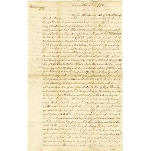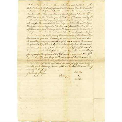 <B>George Read Autograph Document Signed</B></I> “<I>Geo: Read,</B></I>” two pages, 8” x 13”, front and verso. Kent County, November 1773. George Read, Attorney General for the Lower Counties of Delaware, writes, in part, “<I>If he the said Major Henderson should not appear at the these next General Quarter Sessions of the Peace and Gaol Delivery to be held at Dover aforersaid…and then and there abides and performs such order or orders as shou'd be made by the same Court for his assaulting Richard Millatt one of the Constables of the County aforesaid in the Execution of his office…the said George Read who sues…saith that the said Major Henderson did not appear at the these next General Quarter Sessions of the Peace and Gael Delivery held at Dover…</B></I>” Read has signed twice in the text and once at the conclusion. George Read was Attorney General for Lower Delaware (1763-1774) and a Member of the Continental Congress (1774-1777), signing the Declaration of Independence. He later served as Delaware's first U. S. Senator (1789-1793) and Chief Justice of Delaware from 1793 until his death in 1800. Strengthened at mid-horizontal fold in second page. Fine condition.<BR><BR><b>Shipping:</b> Flat Material, Small (<a target="_blank" href="http://www.heritageauctions.com/common/shipping.php">view shipping information</a>)