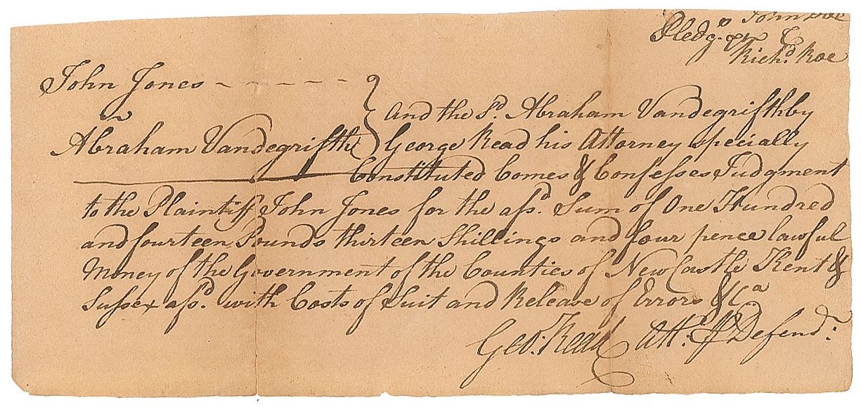 Twice-signed ADS, signed "George Read" and “Geo: Read, Att'y P. Defend'r,” one page, 7.75 x 3.5, no date. Legal document, which reads: "John Jones…and the s'd Abraham Vandergrifth by George Read his Attorney specially Constituted Comes & Confesses Judgment to the Plaintiff John Jones for the ass'd Sum of 100 Hundred and fourteen Pounds thirteen Shillings and four pence lawful Money of the Government of the Counties of New Castle, Kent & Sussex ass'd with Costs of Suit and Release of Errors." Signed within the text and at the conclusion by Read. In very good to fine condition, with tape repairs on the back to two fold separations.