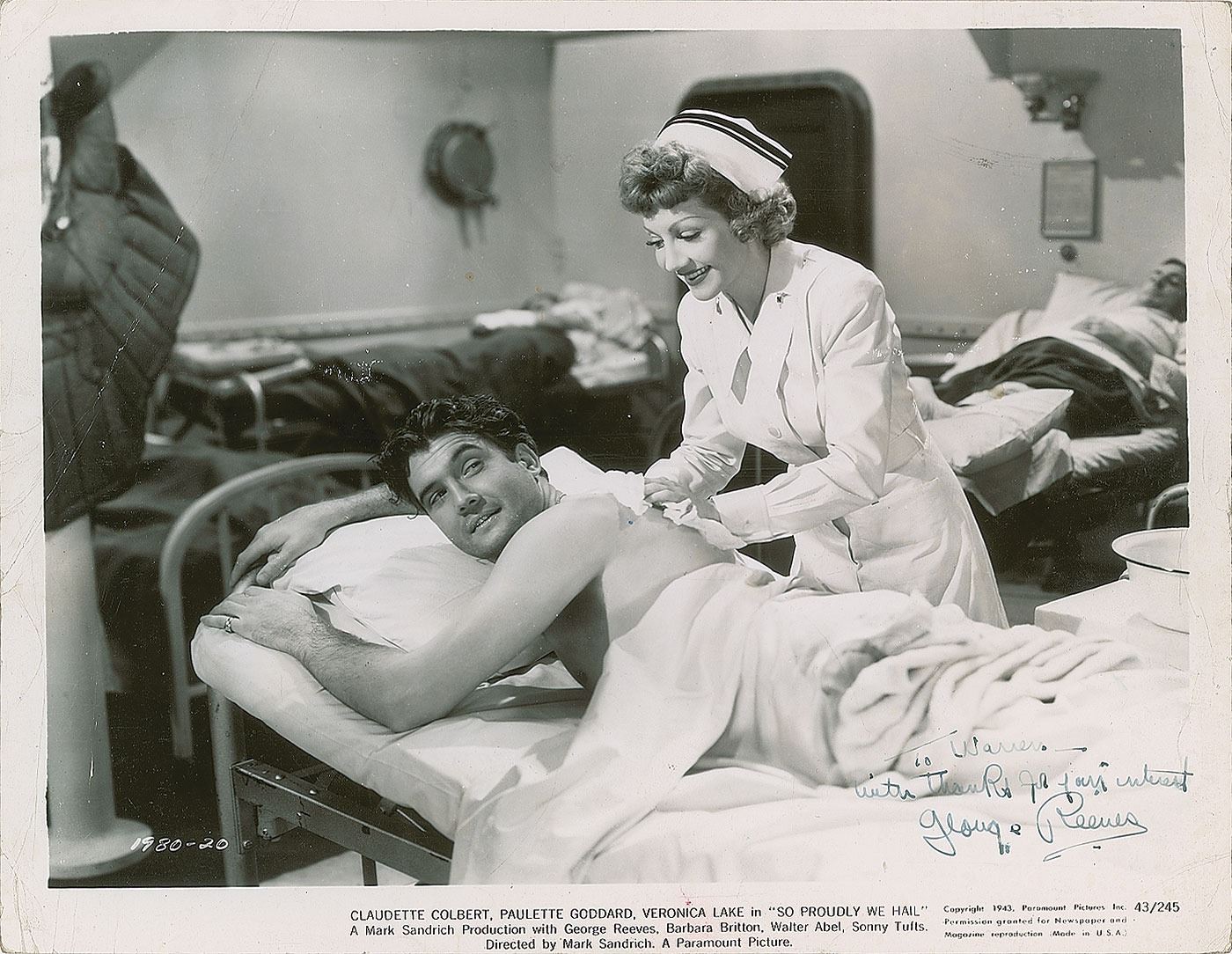 American actor (1914–1959) who is best known for his role as Superman in the 1950s television program Adventures of Superman; his death at the age of 45 from a gunshot remains a polarizing topic. Vintage glossy 10.25 x 8 Paramount Pictures publicity photo for the 1943 film So Proudly We Hail!, signed and inscribed in fountain pen, "To Warren, with thanks for your interest, George Reeves.” In very good condition, with scattered light creasing, and a heavier diagonal crease to the upper left.