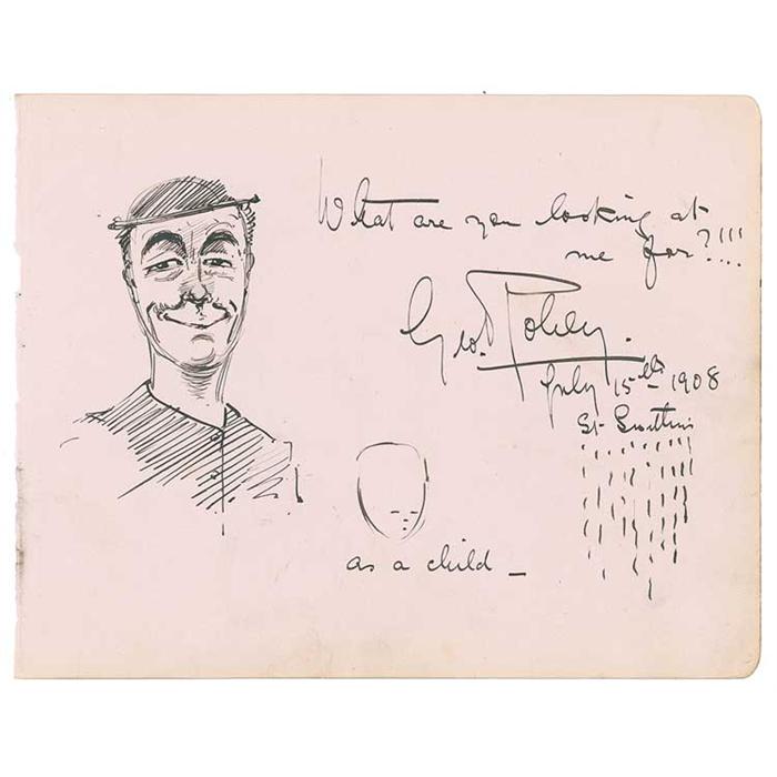 English music hall comedian and star (1869-1954). He was marketed as the "Prime Minister of Mirth." Original vintage signed ink self-portrait on an off-white 9 x 7 album page, signed “What are you looking at me for?!!! Geo. Robey, July 15, 1904, St. Lutheran’s.” Robey also adds another small sketch labeled “as a child.” In fine condition, with a bit of scattered light edge toning. Pre-certified PSA/DNA and RRAuction COA.
