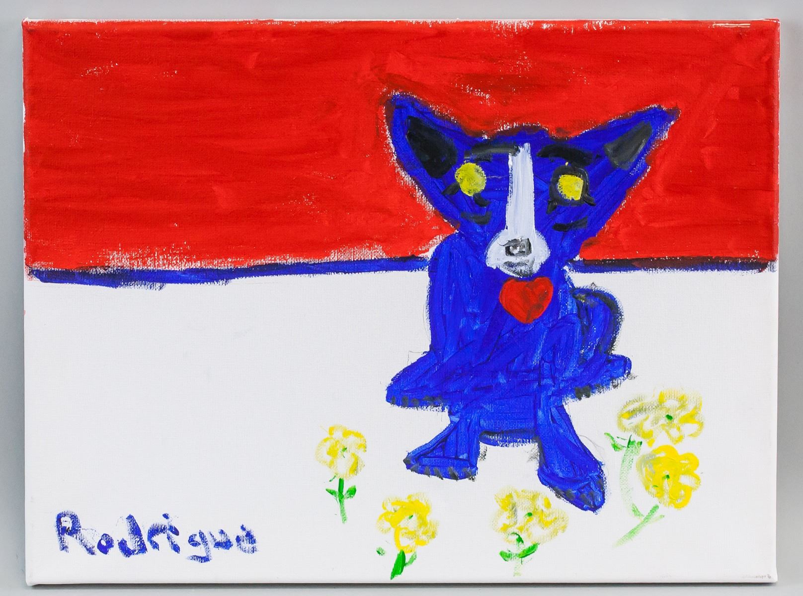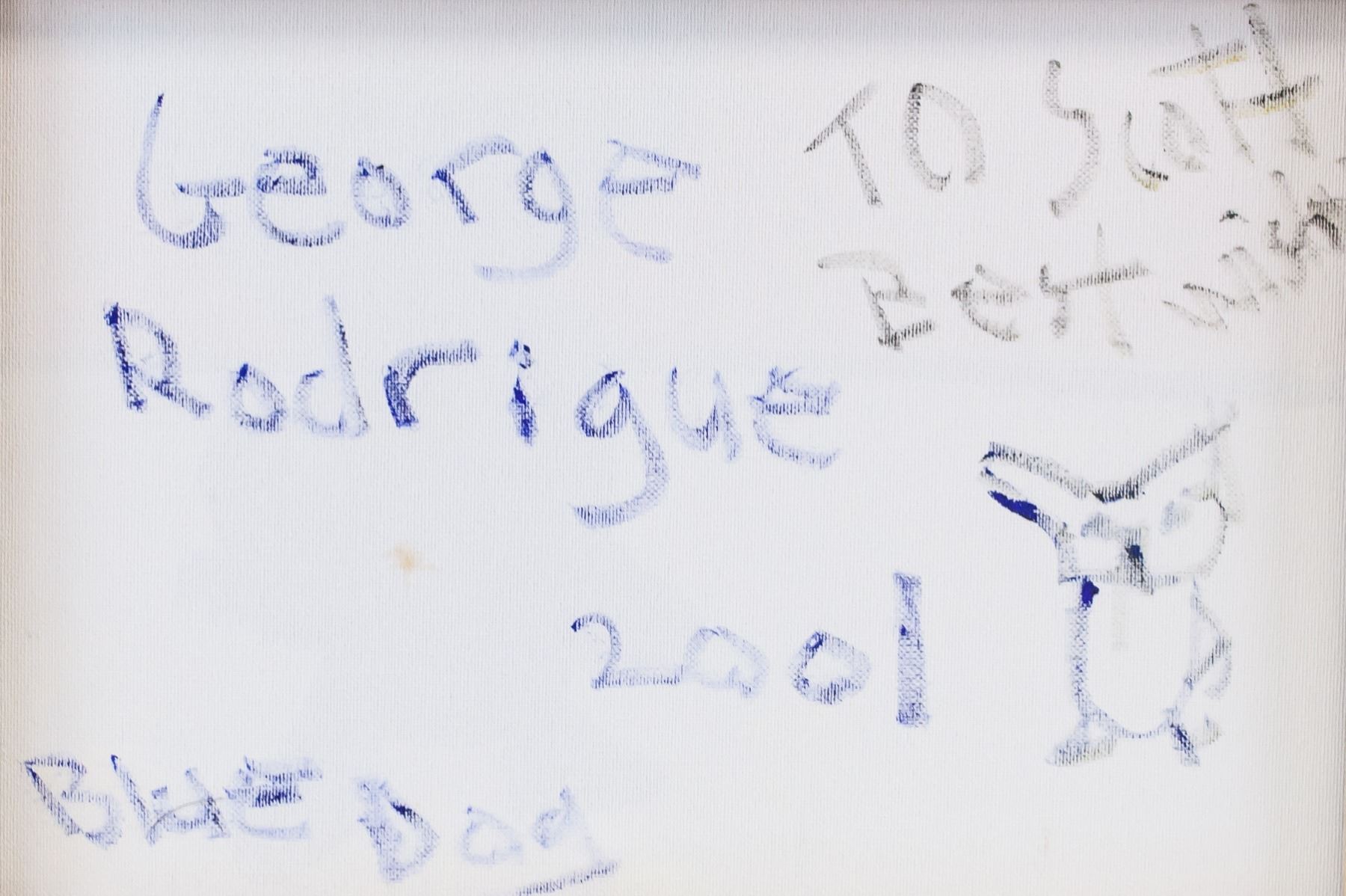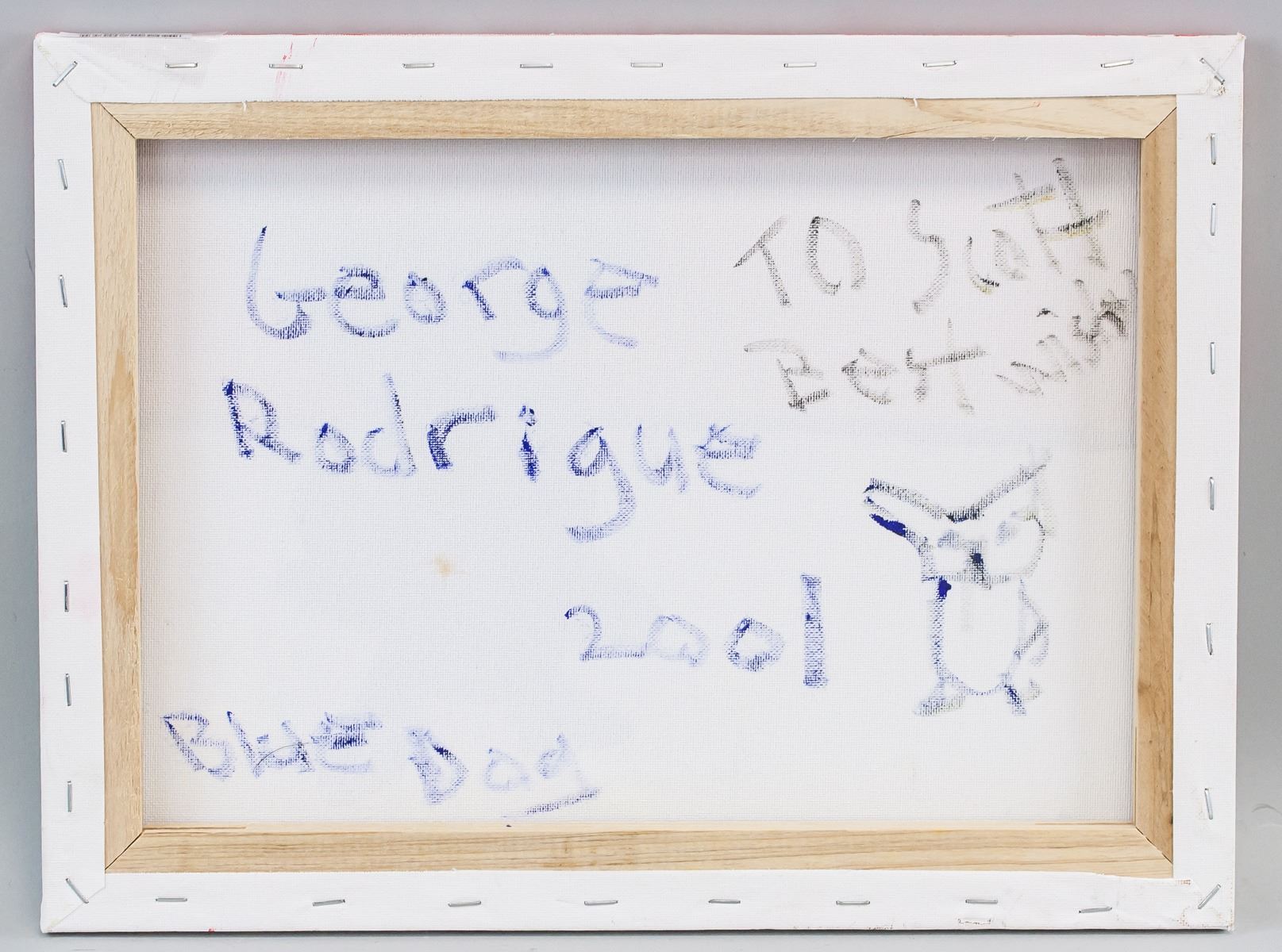 Acrylic on canvas, framed. Featuring a portrait of a dog. Signed Rodrigue on the lower left corner. Inscribed on verso George Rodirgue / 2001 / Blue Dog / To Scott / Best wishes. Attributed to George Rodrigue (1944-2013, American). 31 x 41 cm (12 x 16 inches). Provenance: This lot carries limited provenance from a Southern Ontario estate