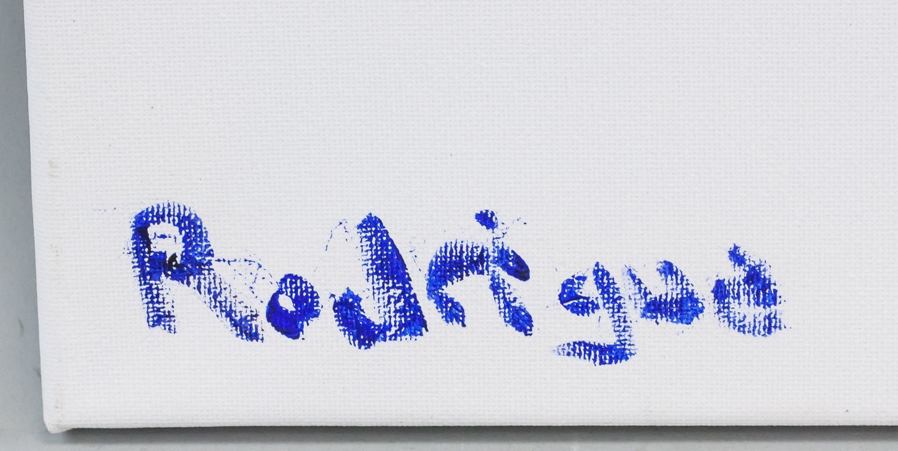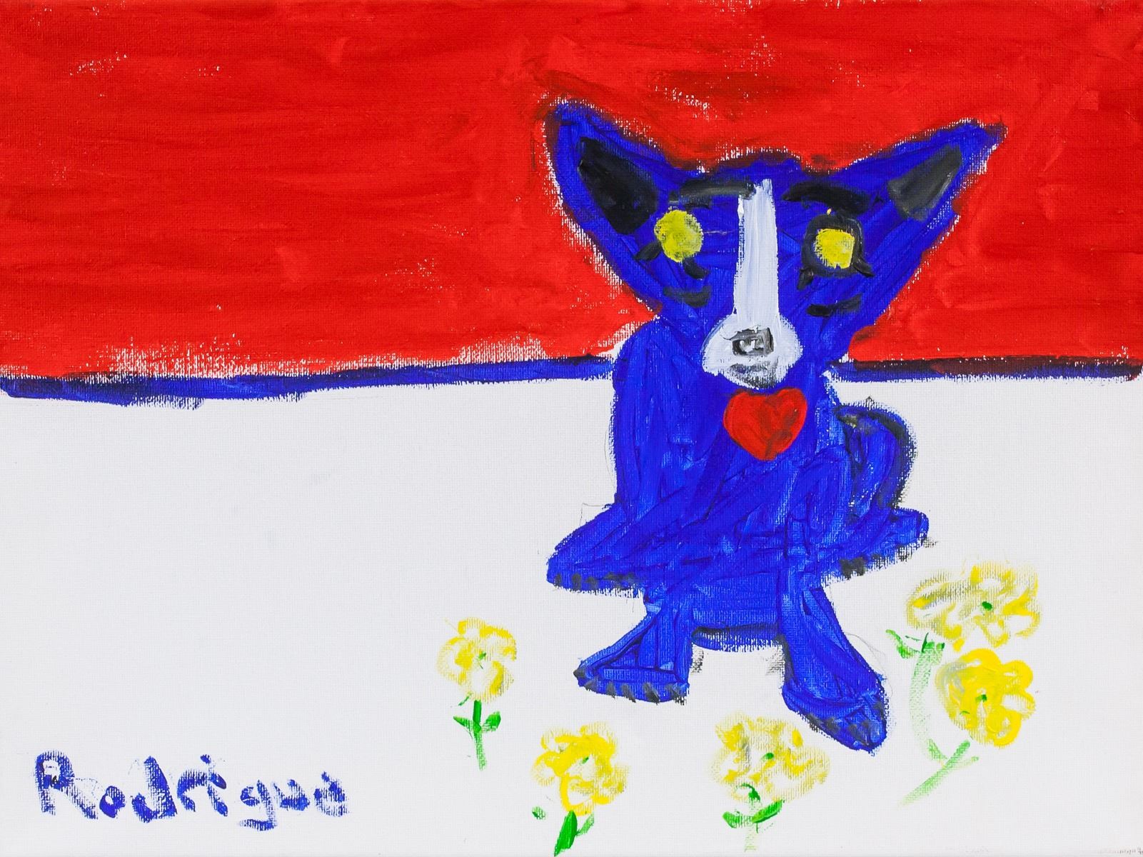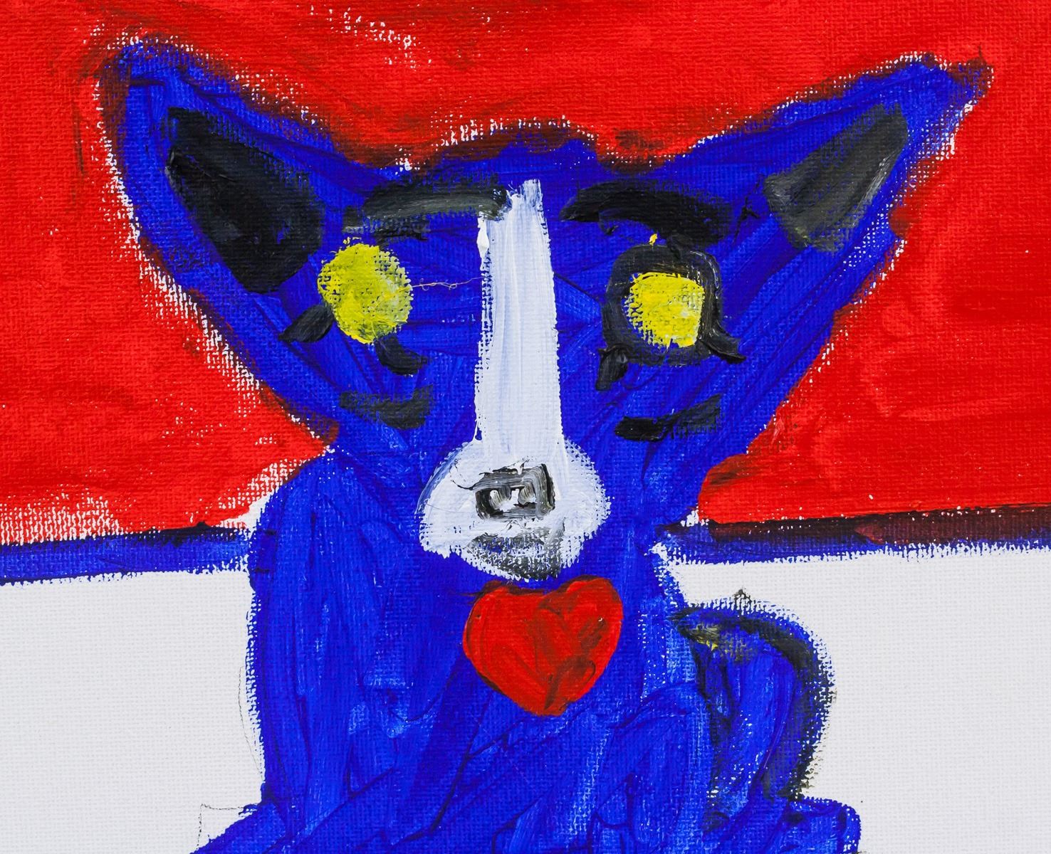 Acrylic on canvas, framed. Featuring a portrait of a dog. Signed Rodrigue on the lower left corner. Inscribed on verso George Rodirgue / 2001 / Blue Dog / To Scott / Best wishes. Attributed to George Rodrigue (1944-2013, American). 31 x 41 cm (12 x 16 inches). Provenance: This lot carries limited provenance from a Southern Ontario estate